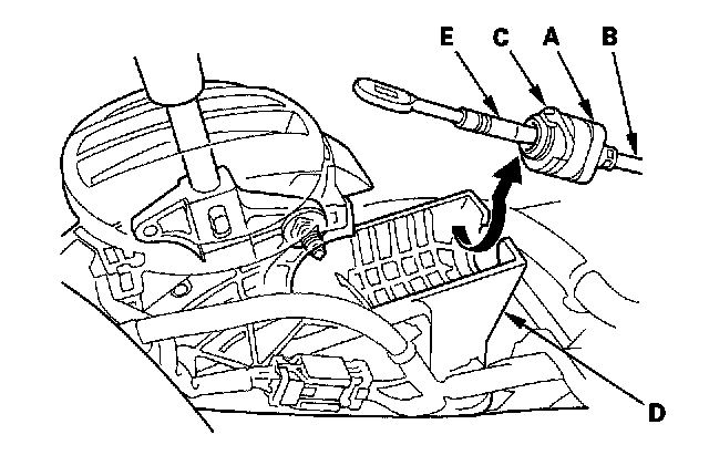 5. Rotate the socket holder (A) on the shift cable (B) a quarter turn; the tab (C) on the socket holder will be in the opening of the shift lever bracket base (D). Then slide the holder to remove the shift cable from the shift lever bracket base. Do not remove the shift cable by twisting the shift cable guide (E).