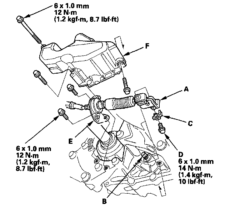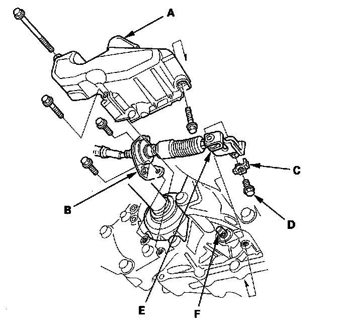 9. Pry up the lock tab of the lock washer (C), and remove the lock bolt (D) and the lock washer, then separate the shift cable (E) from the selector control shaft (F).
