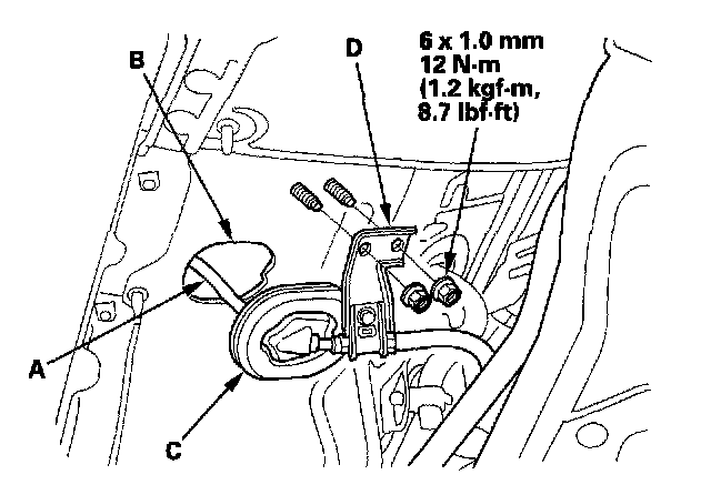 10. Insert the new shift cable (A) through the grommet hole (B), and install the grommet (C) in its hole. Do not bend the shift cable excessively.