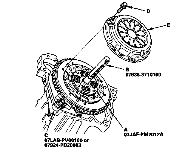3. To prevent warping, unscrew the pressure plate mounting bolts (D) in a crisscross pattern in several steps, then remove the pressure plate (E).