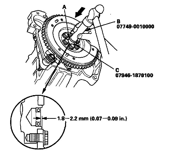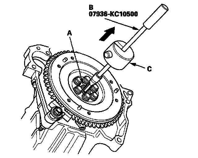 1. Remove the pilot bearing (A) using the bearing remover shaft (B) and the slide hammer (C).