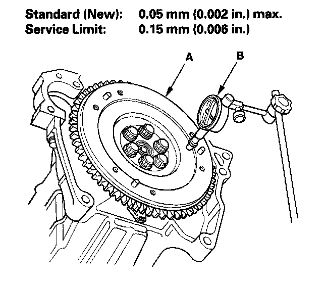 3. Measure the flywheel (A) runout using a dial indicator (B) through at least two full turns with the engine installed. Push against the flywheel each time you turn it to take up the crankshaft thrust washer clearance. If the runout is more than the service limit, replace the flywheel and recheck the runout. Resurfacing the flywheel is not recommended.