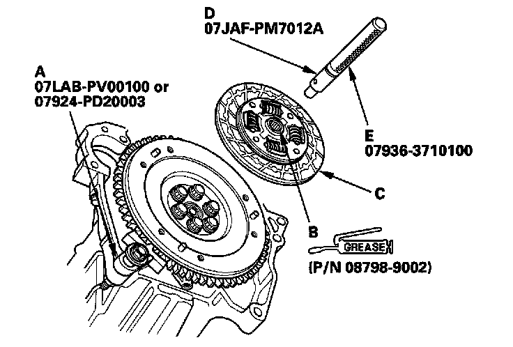 3. Apply super high temp urea grease (P/N 08798-9002) to the splines (B) of the clutch disc (C), then install the clutch disc using the clutch alignment shaft (D), and handle (E).
