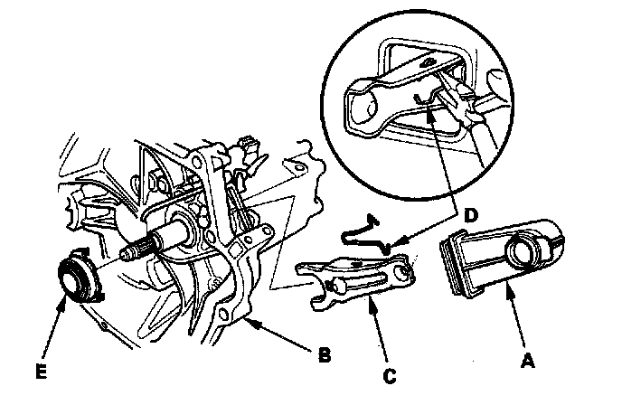 2. Remove the release fork (C) from the clutch housing by squeezing the release fork set spring (D) with pliers. Remove the release bearing (E).