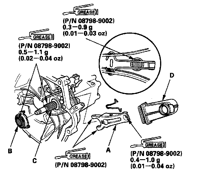 4. Apply super high temp urea grease (P/N 08798-9002) to the release fork (A), the release bearing (B), and release bearing guide (C).