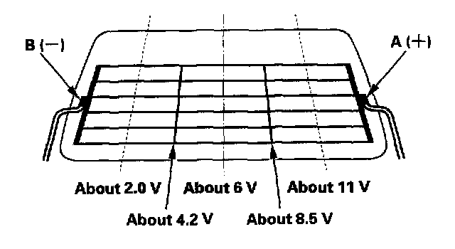 1. Check for voltage between the positive terminal (A) and body ground with the ignition switch and the defogger switch ON. There should be battery voltage.