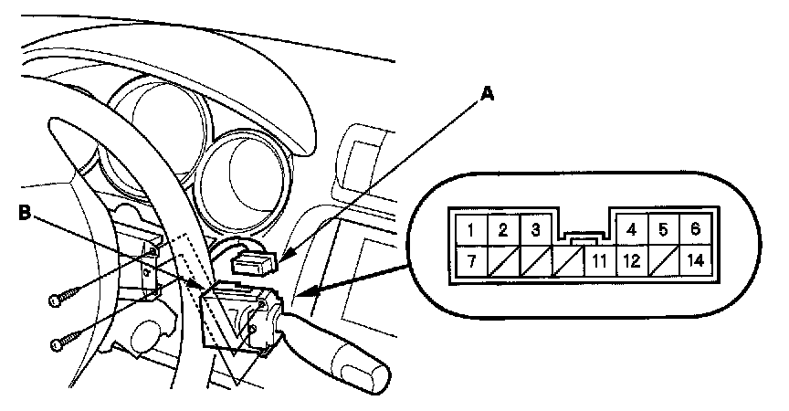 2. Disconnect the 14P connector (A) from the wiper/washer switch (B)