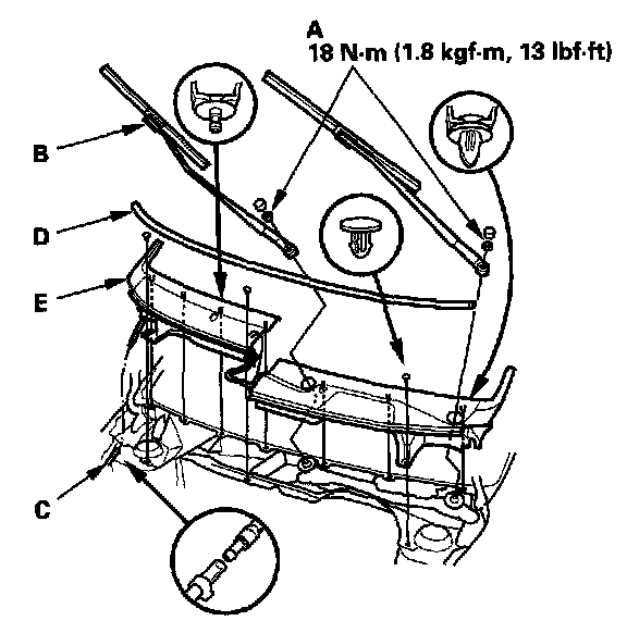 2. Disconnect the washer tube (C), then remove the hood seals (D) and cowl covers (E).
