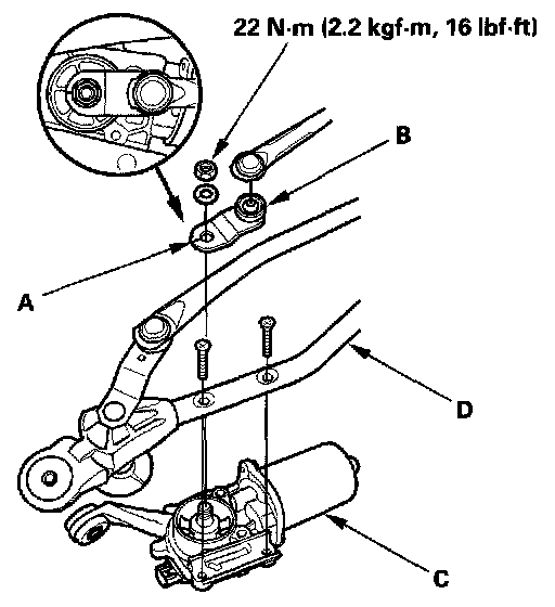 6. Remove the two screws and wiper motor (C) from the wiper linkage (D).