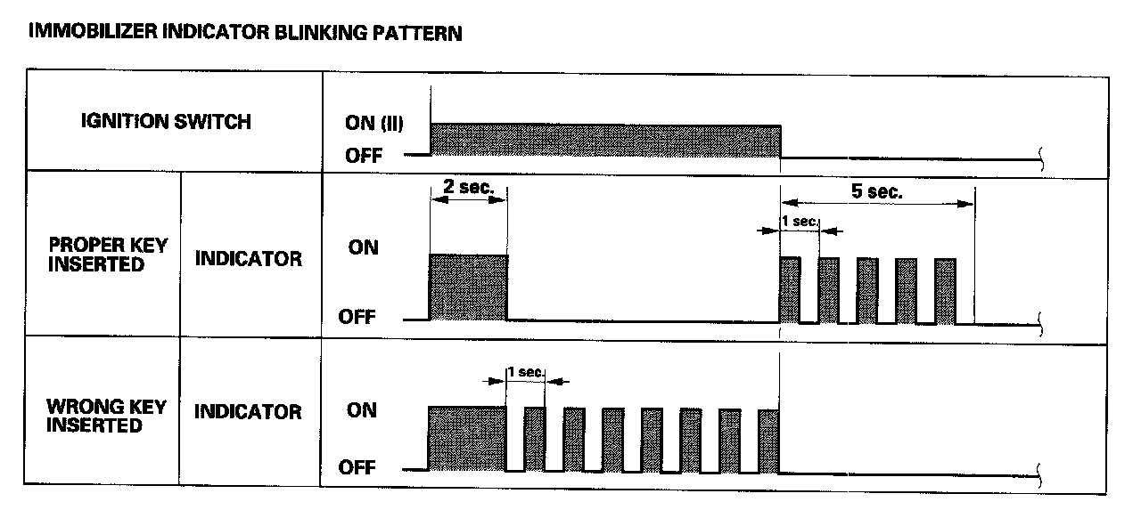 - If the proper key has been used, the immobilizer indicator will come on for about 2 seconds, then go off. When the ignition switch is turned OFF, the indicator will blink for about 5 seconds to signal that the unit has reset correctly, then the indicator will go off.