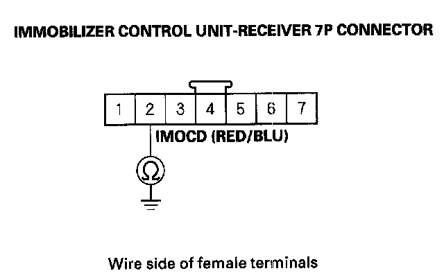 11. Check for continuity between the immobilizer control unit-receiver 7P connector No. 5 (IMOLMP) terminal and body ground.