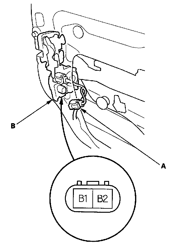 2. Disconnect the 2P connector (A) from the driver's door lock actuator (B).