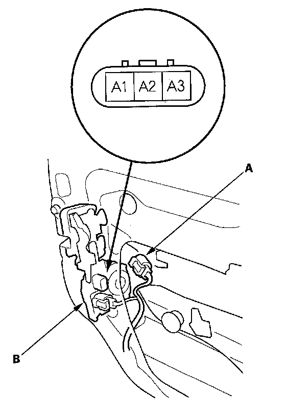 2. Disconnect the 3P connector (A) from the driver's door lock actuator (B).