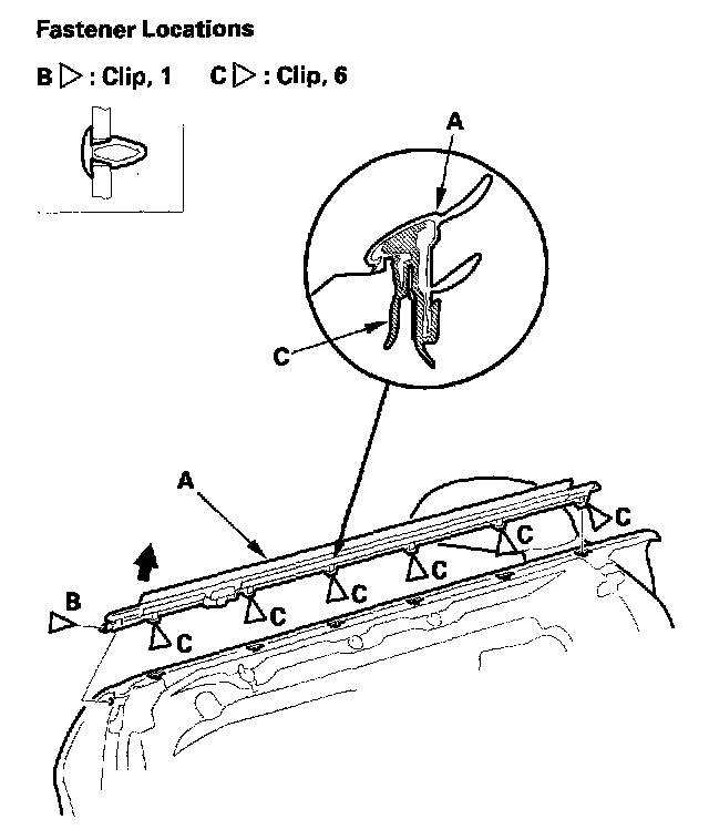 2. Starting at the rear, pry the outer weatherstrip (A) up, and detach the clips (B, C).