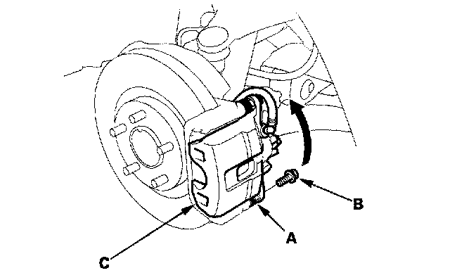 3. Hold the caliper pin (A) with a wrench, being careful not to damage the pin boot. Remove the caliper bolt (B) with another wrench, and pivot the caliper (C) up out of the way. Check the brake hose and pin boots for damage and deterioration.