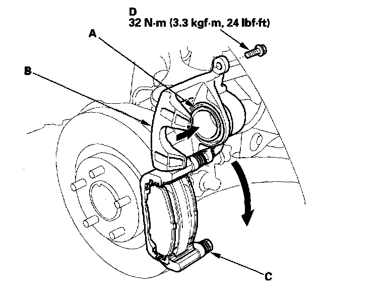 13. Pivot the caliper (B) down into position, being careful not to damage the pin boot. Hold the caliper pin (C) with a wrench, being careful not to damage the pin boot. Install the caliper bolt (D), with another wrench, and torque it to the proper specification.