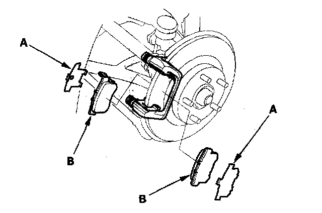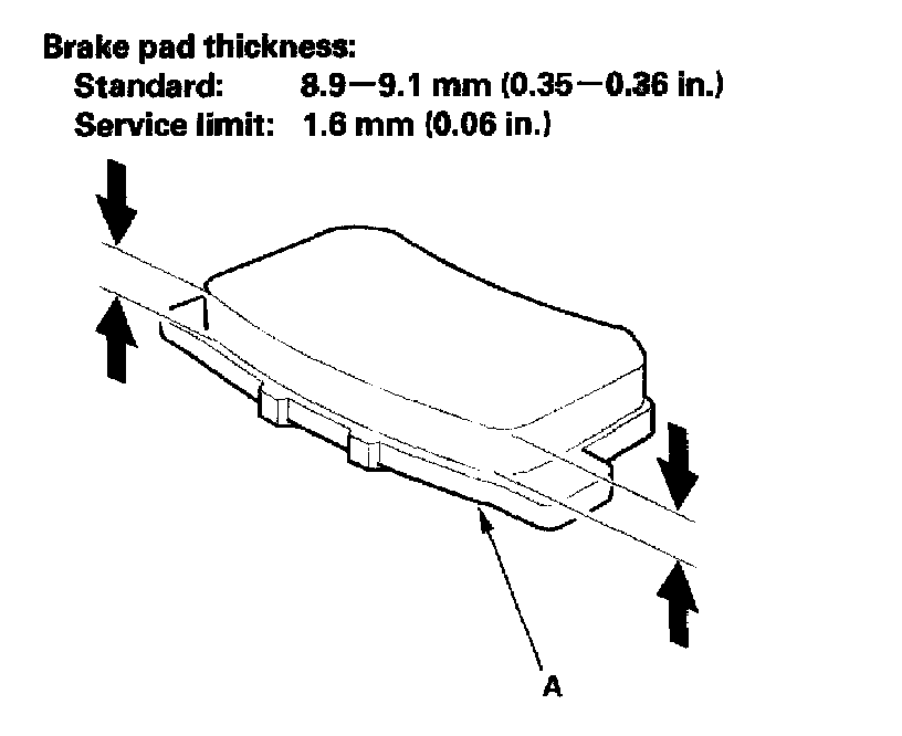 6. Using vernier calipers, measure the thickness of each brake pad lining. The measurement does not include the pad backing plate (A) thickness.