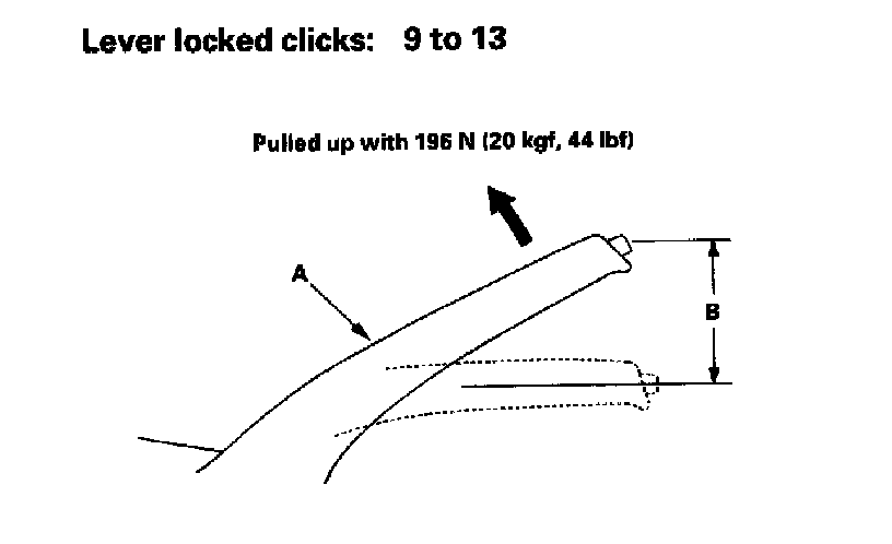 1. Pull the parking brake lever (A) with 196 N (20 kgf, 44 lbs) of force to fully apply the parking brake. The parking brake lever should be locked within the specified clicks (B).