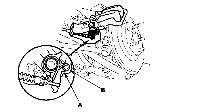 2. Make sure the parking brake arm (A) on the rear brake caliper contacts the brake caliper pin (B).