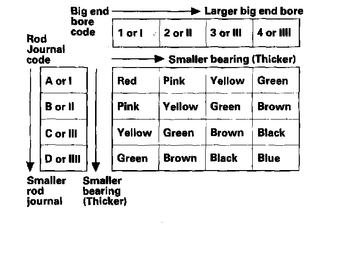 4. Use the big end bore codes and rod journal codes to select appropriate replacement bearings from the following table.