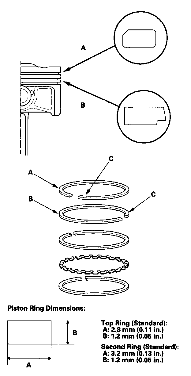 5. Measure the piston ring end-gap (B) with a feeler gauge: