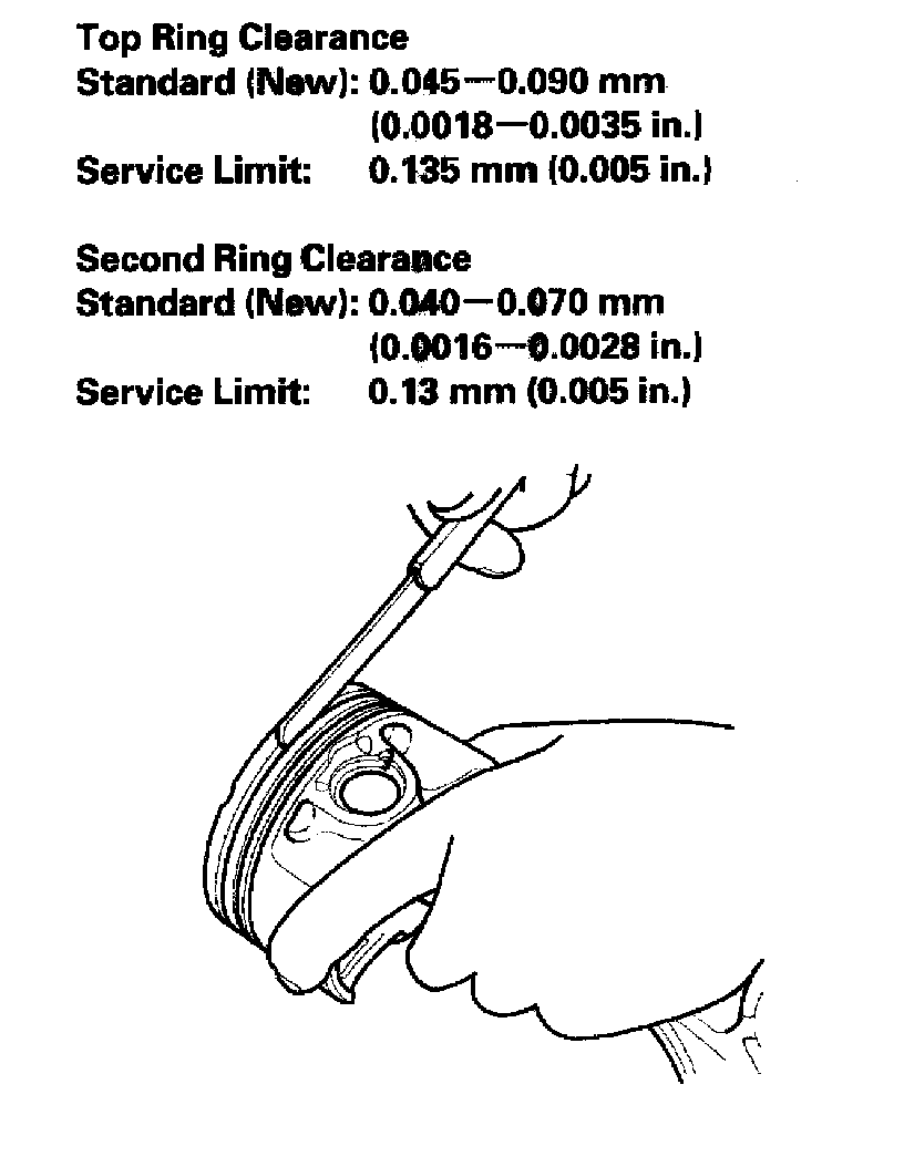 ^ If the gap is too large, recheck the cylinder bore diameter against the wear limits. If the bore is over the service limit, the engine block must be rebored.