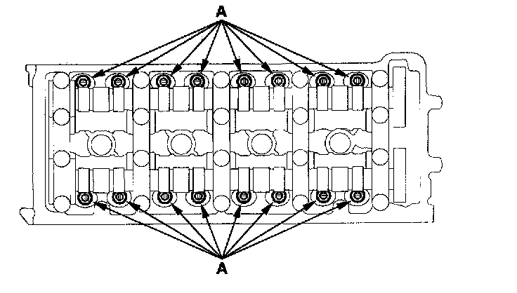 3. Remove the camshaft holders and camshafts. To prevent damaging the camshafts, unscrew the camshaft holder bolts two turns at a time, in a crisscross pattern.