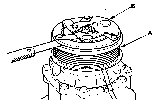 3. Measure the clearance between the rotor pulley (A) and the armature plate (B) all the way around. If the clearance is not within specified limits, remove the armature plate and add or remove shims as needed to increase or decrease clearance.