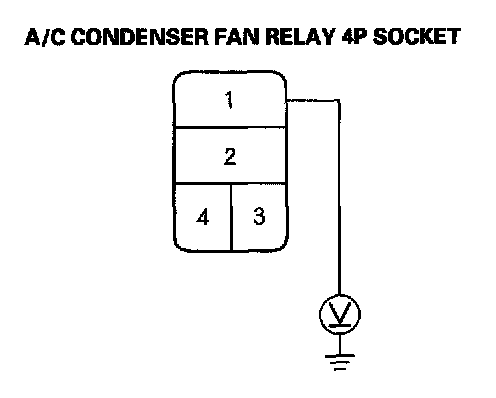 3. Measure the voltage between the No. 1 terminal of the A/C condenser fan relay 4P socket and body ground.