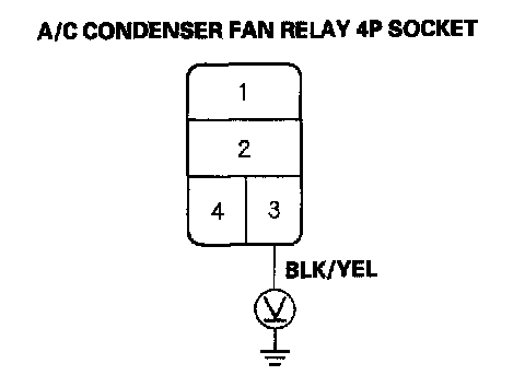 10. Check for continuity between the No. 2 terminal of the A/C condenser fan relay 4P socket and the No. 2 terminal of the A/C condenser fan 2P connector.
