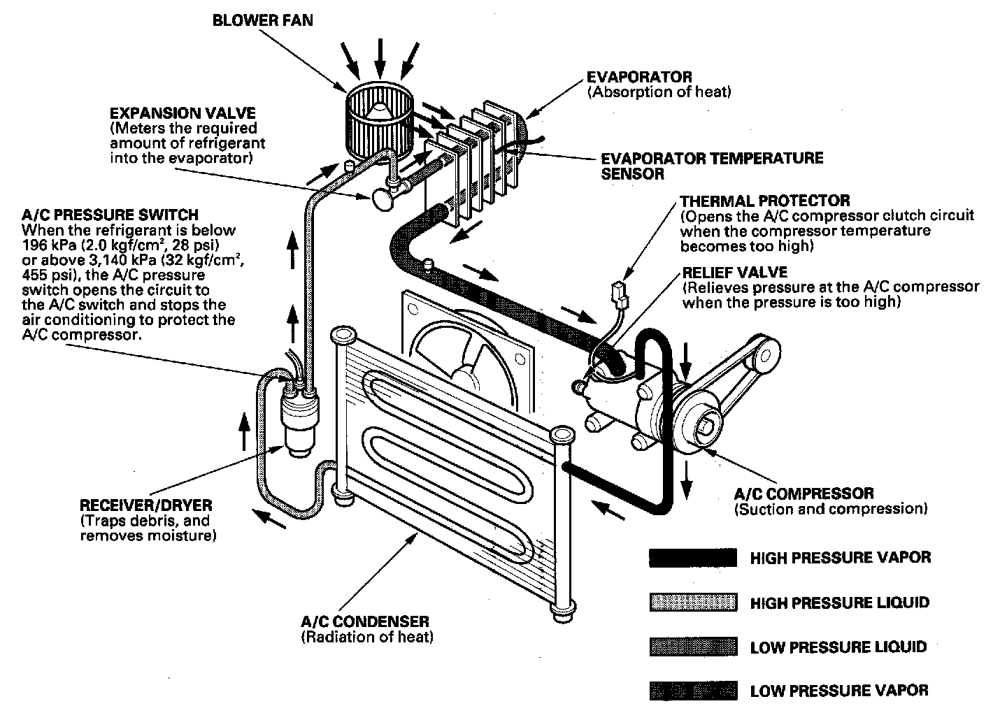 The air conditioner system removes heat from the passenger compartment by circulating refrigerant through the system as shown below.