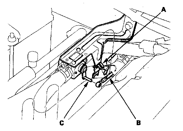 2. From under the dash, disconnect the heater valve cable housing from the cable clamp (A), and disconnect the heater valve cable (B) from the air mix control linkage (C).