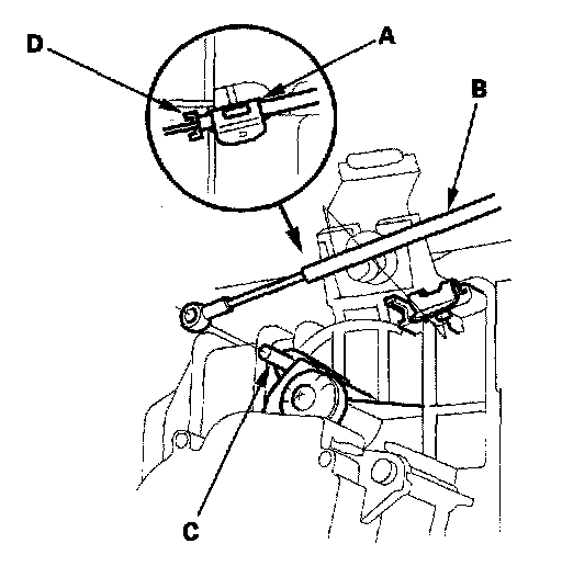 4. Attach the heater valve cable (B) to the air mix control linkage (C) as shown above. Hold the end of the heater valve cable housing against the stop (D), then snap the heater valve cable housing into the cable clamp (A).