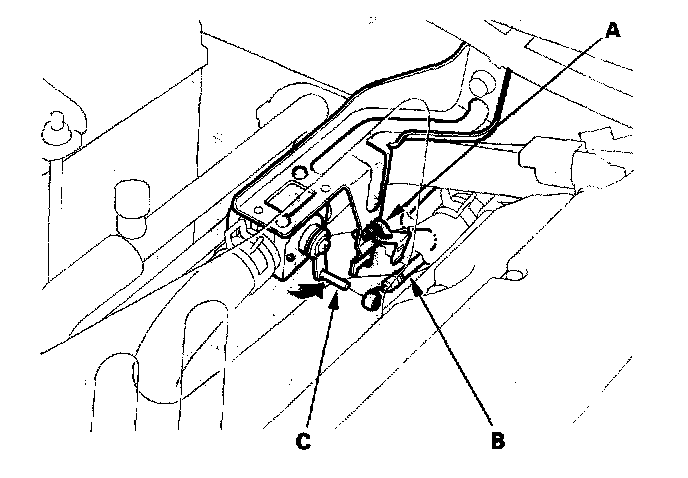 Heater Valve Cable Adjustment1. From under the hood, open the cable clamp (A), then disconnect the heater valve cable (B) from the heater valve arm (C).