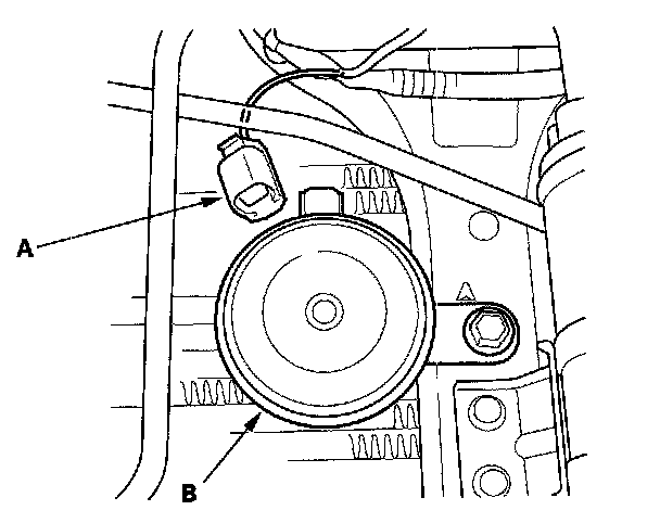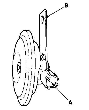 4. Test the horn by connecting battery power to the terminal (A) and grounding to the bracket (B). The horn should sound.