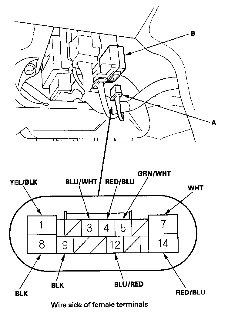 1. Disconnect the 14P connector (A) from the daytime running lights subcontrol unit (B).