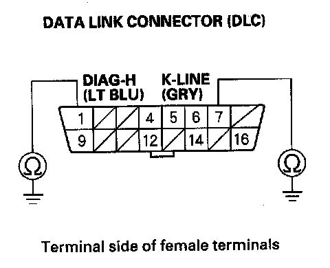 15. Check for continuity between DLC terminals No. 1 and No. 7 and body ground individually.