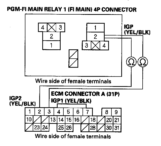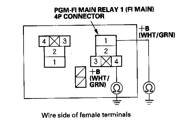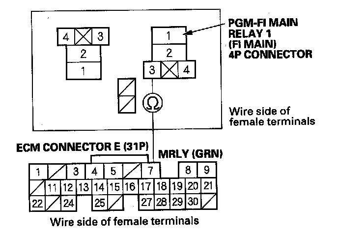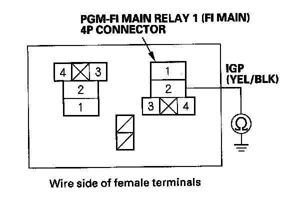 38. Check for continuity between body ground and PGM-FI main relay 1 (FI MAIN) 4P connector terminals No. 1 and No. 4 individually.