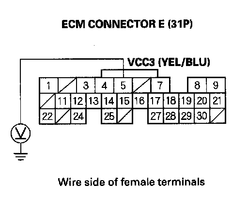 91. Disconnect the connector from each of these sensor, one at time, and measure voltage between body ground and ECM connector terminal E5 with the ignition switch ON (II).