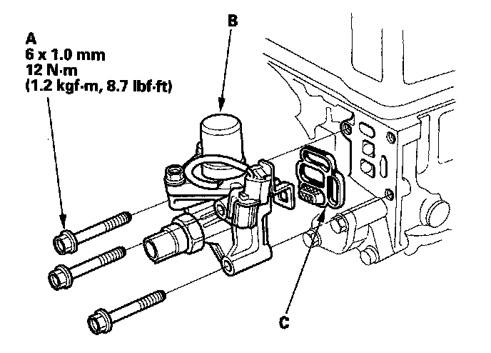 3. Remove the rocker arm oil control valve (VTEC solenoid valve) (B).