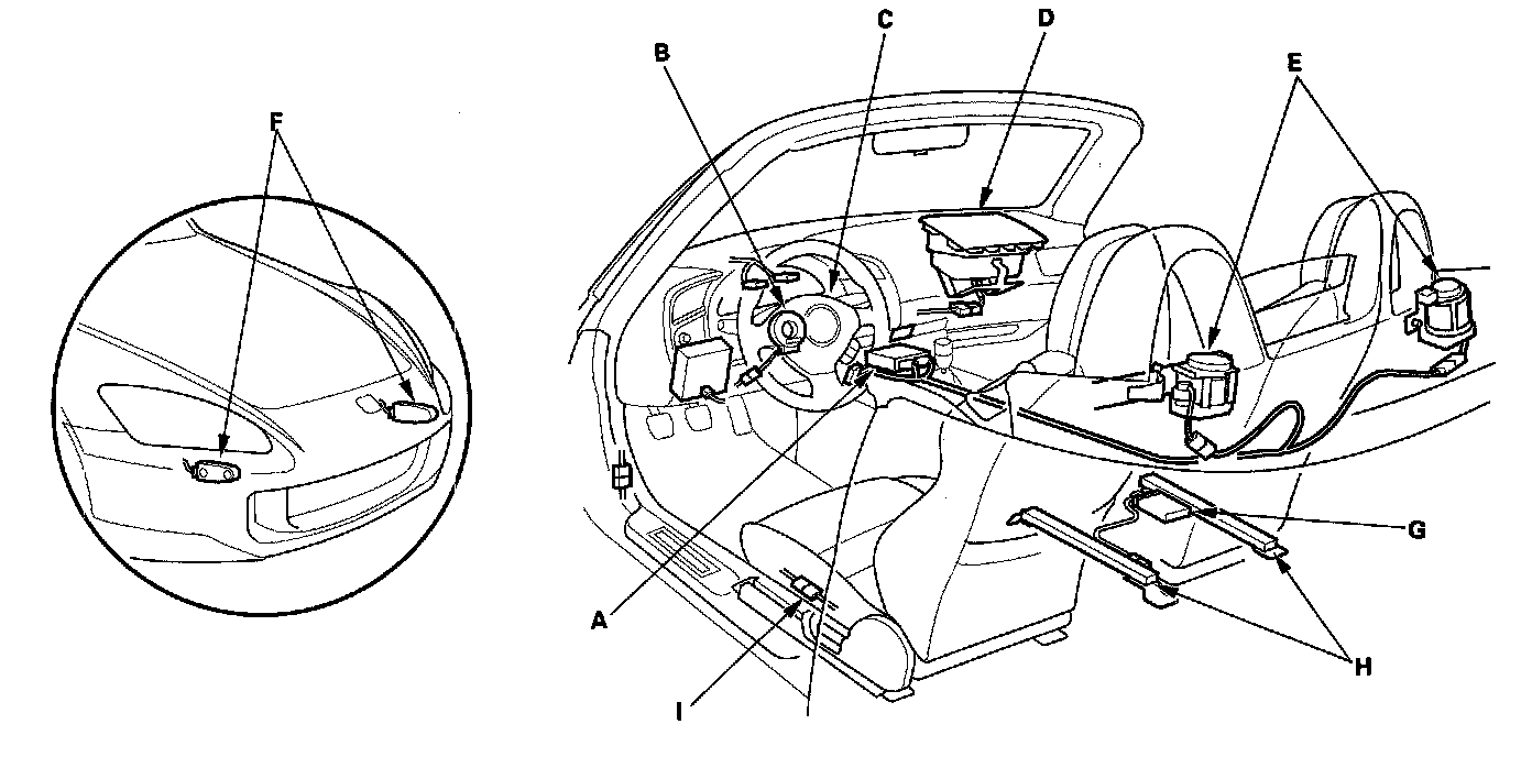 The driver's seat position sensor (I) is under the driver's seat on the left side. When the driver's seat is moved to its full forward position, the deployment of the driver's airbag is moderated to decrease its force of impact during a front-end collision.