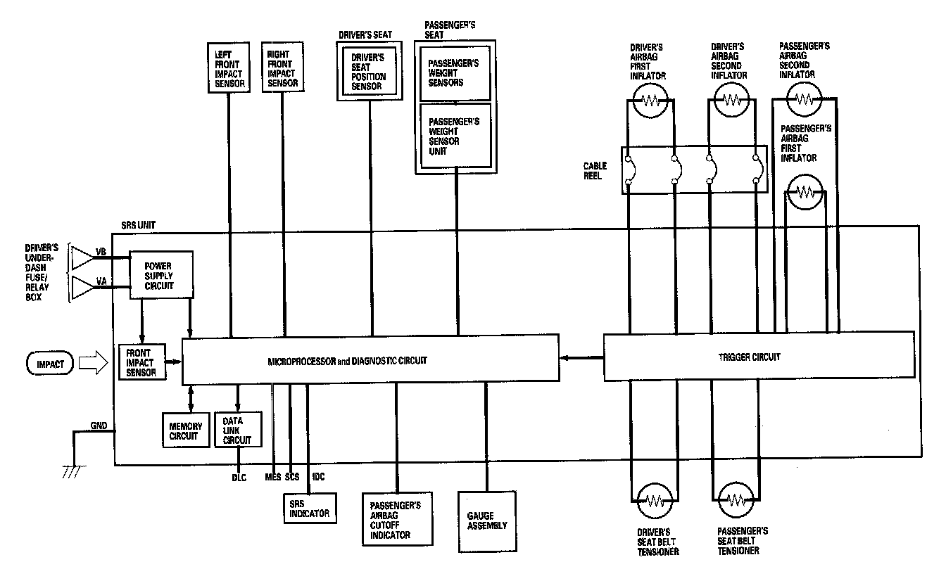 The main circuit in the SRS unit senses and judges the force of impact and, if necessary, ignites the inflator charges. If battery voltage is too low or power is disconnected due to the impact, the voltage regulator and the back-up power circuit will keep voltage at a constant level.