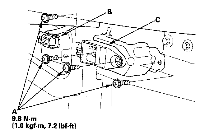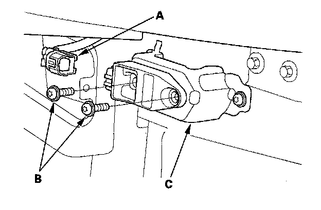 1. Install the new front impact sensor with TORX bolts (A), then connect the engine compartment wire harness 2P connector (B) to the front impact sensor (C).