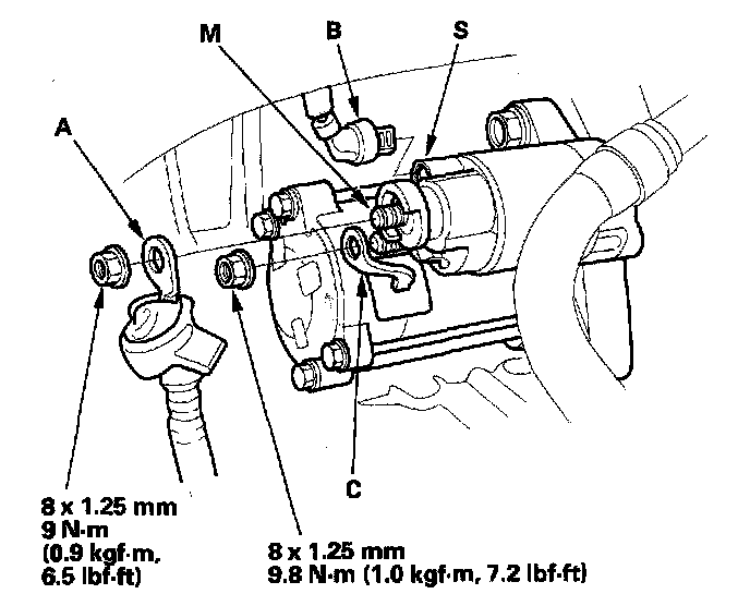 3. Disconnect the starter cable (A), BLK/WHT wire (B), and motor cable (C).