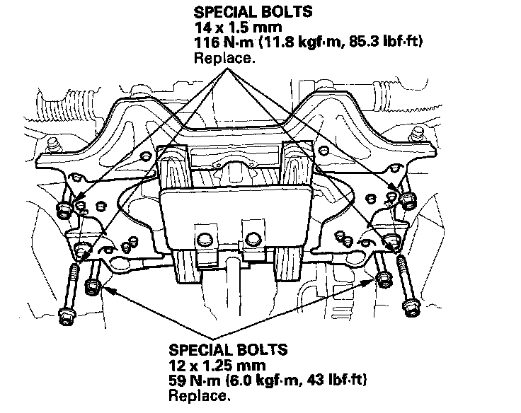 8. Raise the transmission, then install the three transmission rear mount bolts.