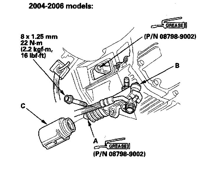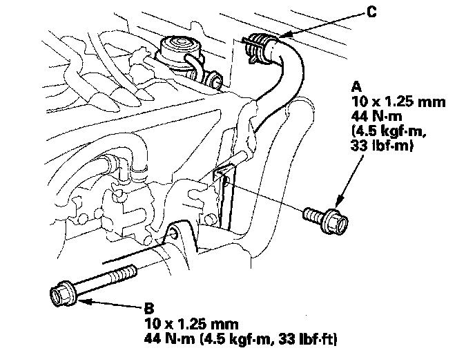 27. 2000-2005 models: Install the upper intake manifold bracket mounting bolt (A) and upper starter motor mounting bolt (B). Connect the hose (C) to the suction valve.