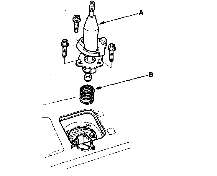 6. Remove the three bolts, then remove the shift lever (A) and the shift lever spring (B).