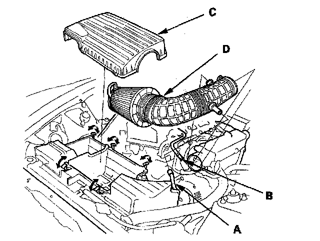 7. 2000-2005 models: Disconnect the air hose (A) and breather pipe (B), then remove the air cleaner housing cover (C) and air cleaner element assembly (D).