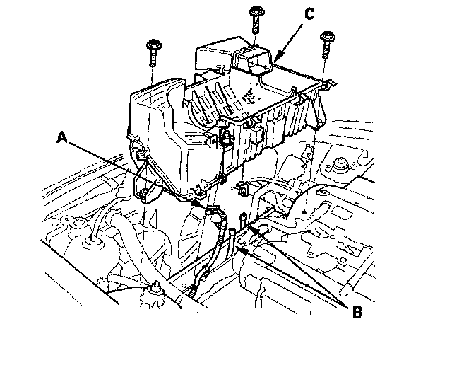 8. 2000-2005 models: Disconnect the control solenoid valve connector (A) and vacuum hoses (B), then remove the air cleaner housing (C).
