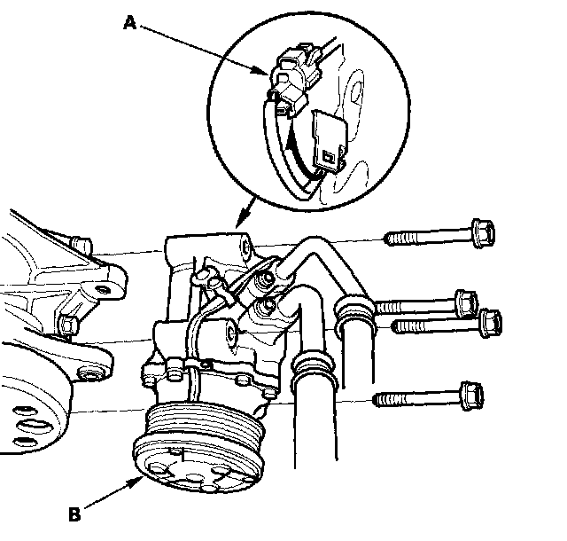 14. Disconnect the 1P connector (A), then remove the four mounting bolts and the A/C compressor (B). Hang the A/C compressor to the body with a suitable strap.